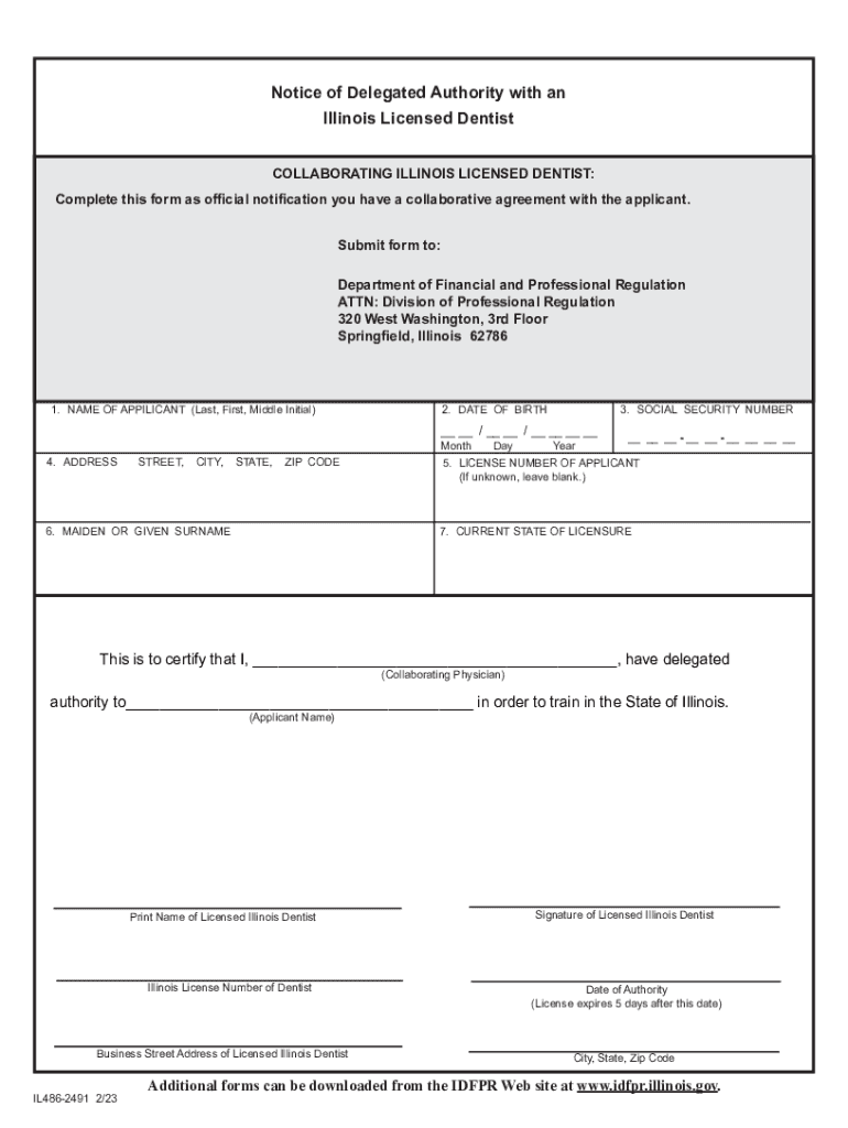 Notice of Delegated Authority with an Illinois Licensed Dentist COLLABORATING ILLINOIS LICENSED DENTIST: Complete this form as social notification you have a collaborative agreement with the applicant.