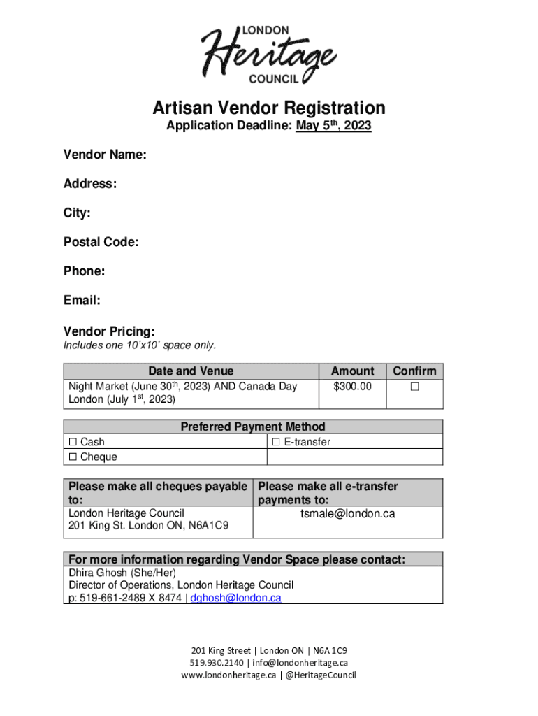 Artisan Vendor Registration Application Deadline: May 5th, 2023 Vendor Name: Address: City: Postal Code: Phone: Email: Vendor Pricing: Includes one 10×10 space only. Date and Venue 30th,Night Market
