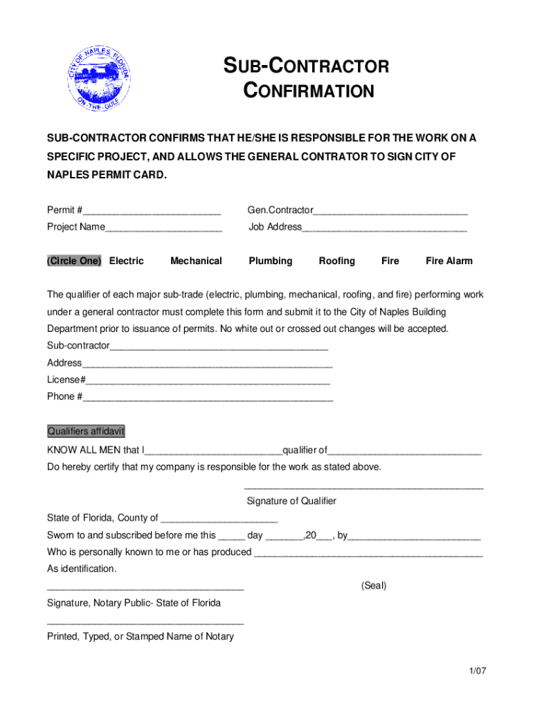 SUBCONTRACTOR CONFIRMATION SUBCONTRACTOR CONFIRMS THAT HE/SHE IS RESPONSIBLE FOR THE WORK ON A SPECIFIC PROJECT, AND ALLOWS THE GENERAL CONTRACTOR TO SIGN CITY OF NAPLES PERMIT CARD. P Permit #___Gen.Contractor___Project