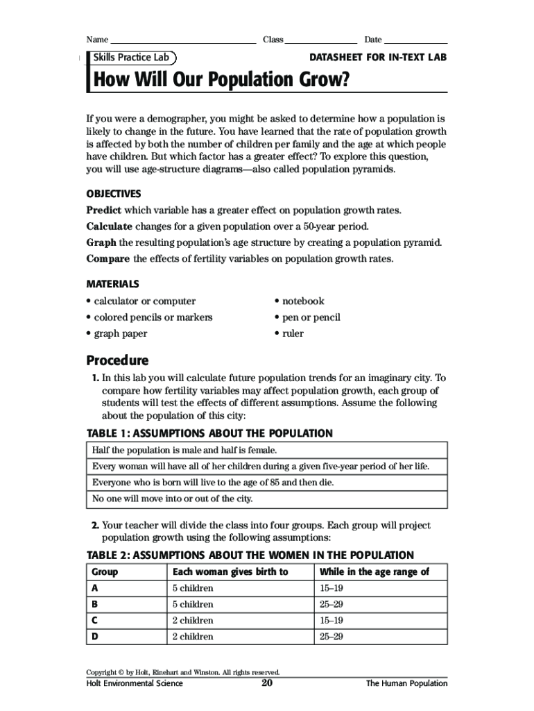 BackLessonPrintNameClassSkills Practice LabDateDATASHEET FOR INTENT Labor Will Our Population Grow? If you were a demographer, you might be asked to determine how a population is likely to change