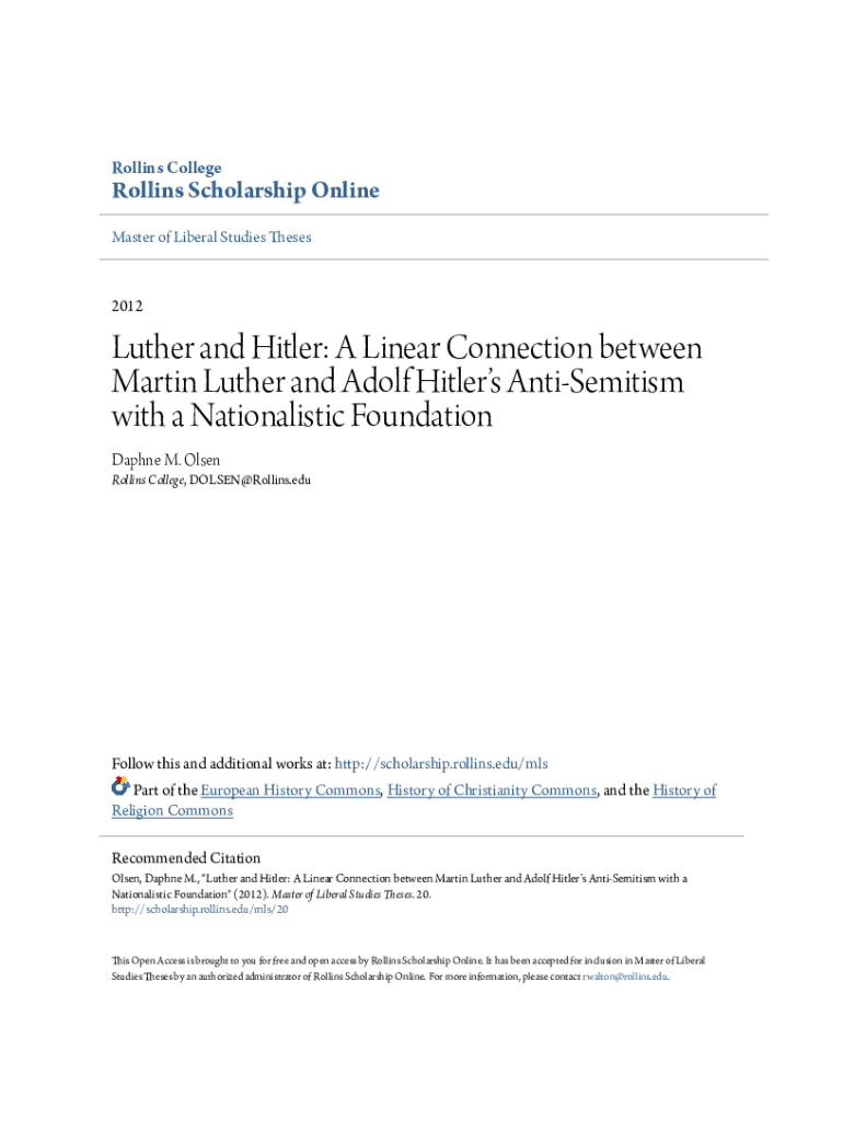 Rollins College Rollins Scholarship Online Master of Liberal Studies Theses2012Luther and Hitler: A Linear Connection between Martin Luther and Adolf Hitlers Antisemitism with a Nationalistic Foundation