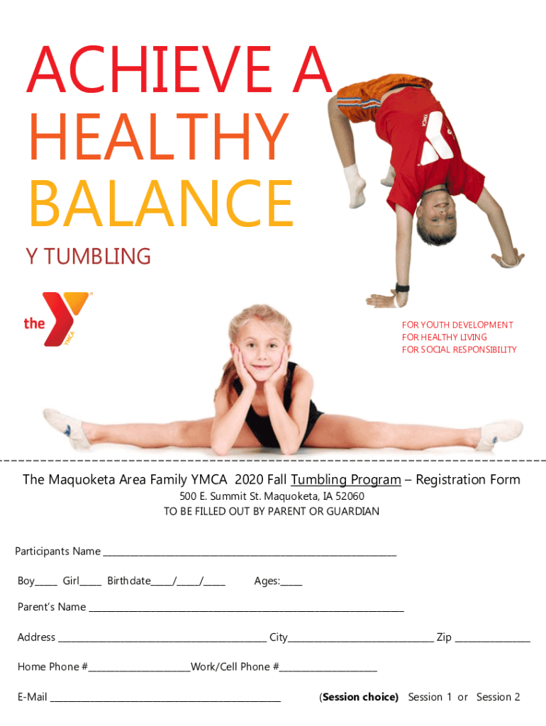 ACHIEVE A HEALTHY BALANCE Y TUMBLING YOUTH DEVELOPMENT FOR HEALTHY LIVING FOR SOCIAL Responsibility Maquoketa Area Family YMCA 2020 Fall Tumbling Program Registration Form 500 E. Summit St. Maquoketa,