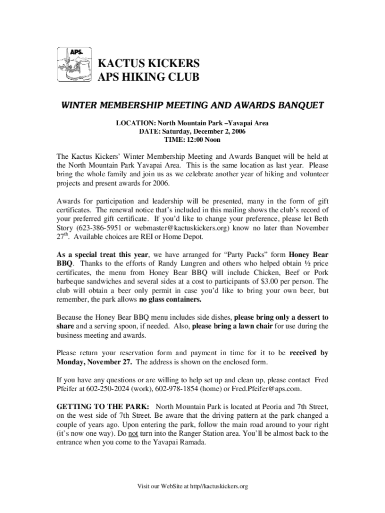 CACTUS KICKERS APS HIKING CLUB WINTER MEMBERSHIP MEETING AND AWARDS BANQUET LOCATION: North Mountain Park Bavaria Area DATE: Saturday, December 2, 2006, TIME: 12:00 Soothe Cactus Kickers Winter Membership