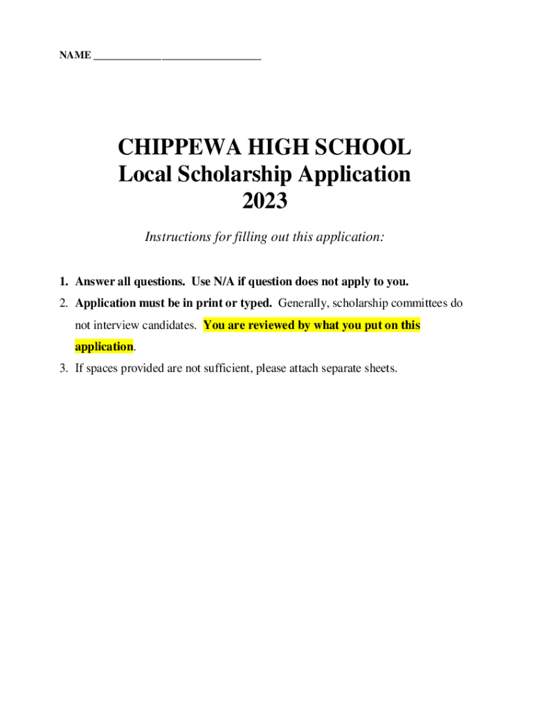 NAME ___CHIPPEWA HIGH SCHOOL Local Scholarship Application 2023 Instructions for filling out this application: 1. Answer all questions. Use N/A if question does not apply to you. 2. Application must