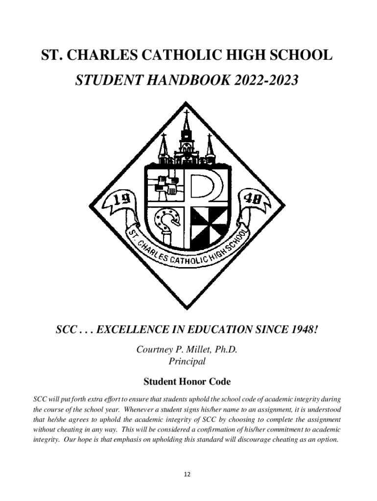 ST. CHARLES CATHOLIC HIGH SCHOOL STUDENT HANDBOOK 20222023SCC. . . EXCELLENCE IN EDUCATION SINCE 1948! Courtney P. Millet, Ph.D. Principal Student Honor Code SCC will put forth extra effort to ensure