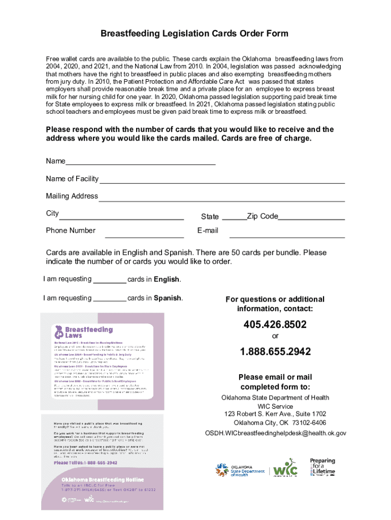 Breastfeeding Legislation Cards Order Form Free wallet cards are available to the public. These cards explain the Oklahoma breastfeeding laws from 2004, 2020, and 2021, and the National Law from 2010.