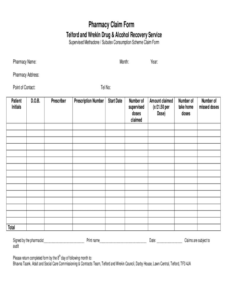 Pharmacy Claim Form Tel ford and Resin Drug & Alcohol Recovery Service Supervised / Subtext Consumption Scheme Claim Polypharmacy Name:Month:Year:Pharmacy Address: Point of Contact: Patient Initials.