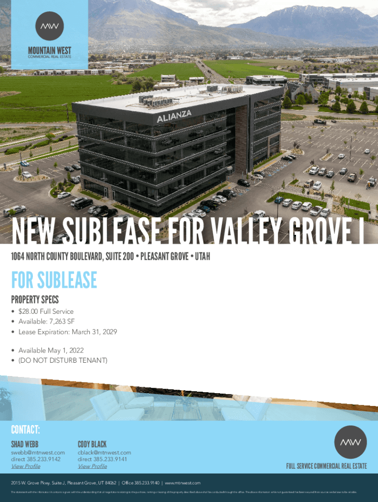 NEW SUBLEASE FOR VALLEY GROVE I 1064 NORTH COUNTY Boulevards, SUITE 200 PLEASANT GROVE AUTHOR SUBLEASE PROPERTY SPECS$28.00 Full Service Available: 7,263 SF Lease Expiration: March 31, 2029, Available