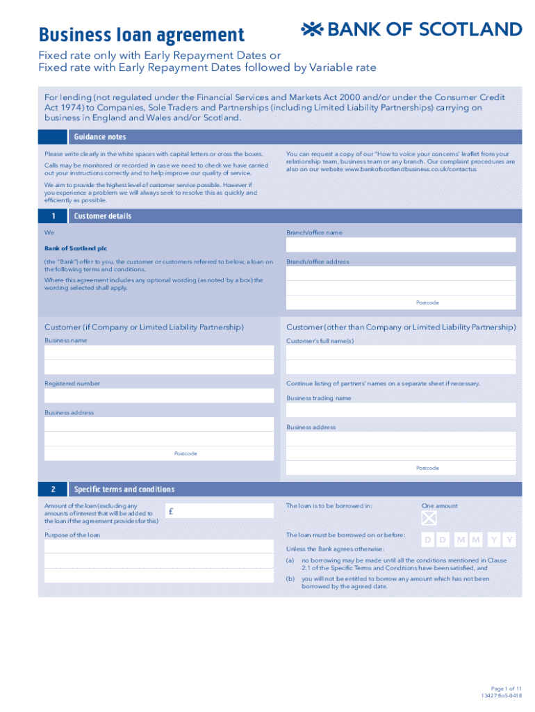 Business loan agreement Fixed rate only with Early Repayment Dates or Fixed rate with Early Repayment Dates followed by Variable rattler ALL Fields lending (not regulated under the Financial Services