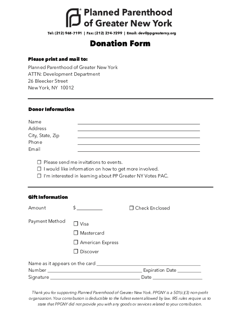 Tel: (212) 9657191 | Fax: (212) 2747299 | Email: dev@ppgreaterny.orgDonation Form Please print and mail to: Planned Parenthood of Greater New York ATTN: Development Department 26 Becker Street New