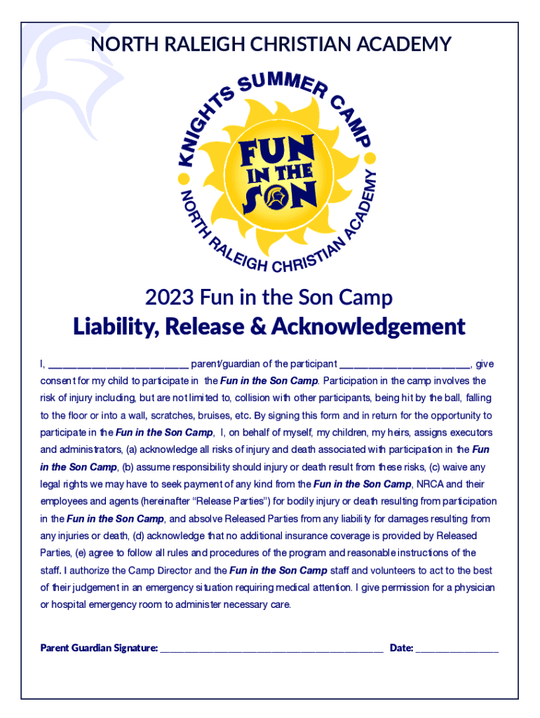 TSS U M ME CAMPING NORTH RALEIGH CHRISTIAN ACADEMY2023 Fun in the Son Capability, Release & Acknowledgement I, ___ parent/guardian of the participant ___, give consent for my child to participate