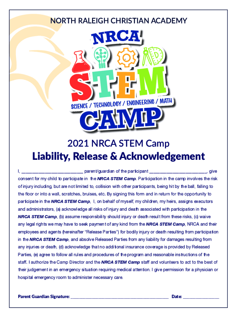 NORTH RALEIGH CHRISTIAN ACADEMY ECAMP2021 NACA STEM Capability, Release & Acknowledgement I, ___ parent/guardian of the participant ___, give consent for my child to participate in the NACA STEM Camp.