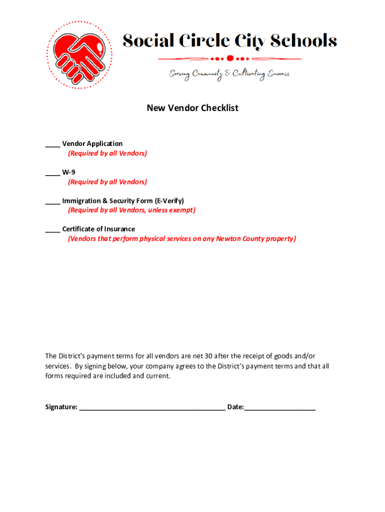 New Vendor Checklist ___ Vendor Application (Required by all Vendors) ___ W9 (Required by all Vendors) ___ Immigration & Security Form (Verify) (Required by all Vendors, unless exempt) ___ Certificate