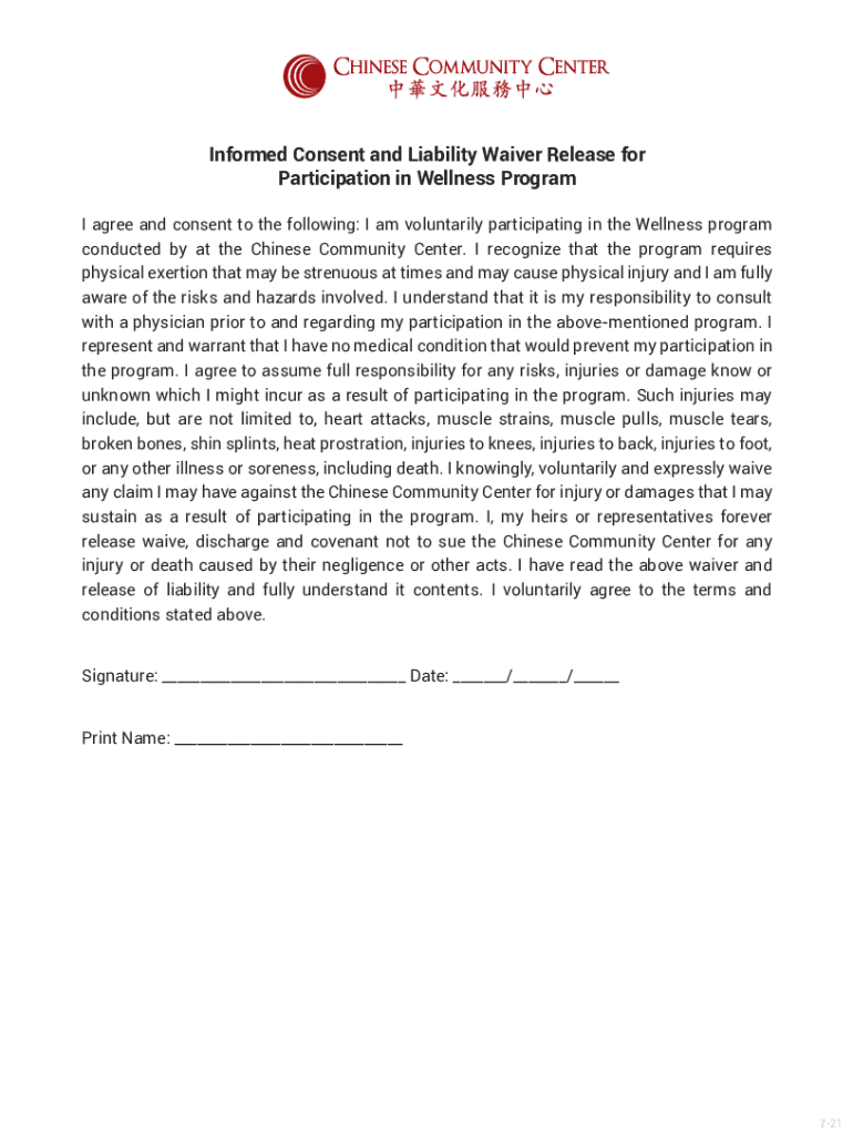 Informed Consent and Liability Waiver Release for Participation in Wellness Program I agree and consent to the following: I am voluntarily participating in the Wellness program conducted by at the