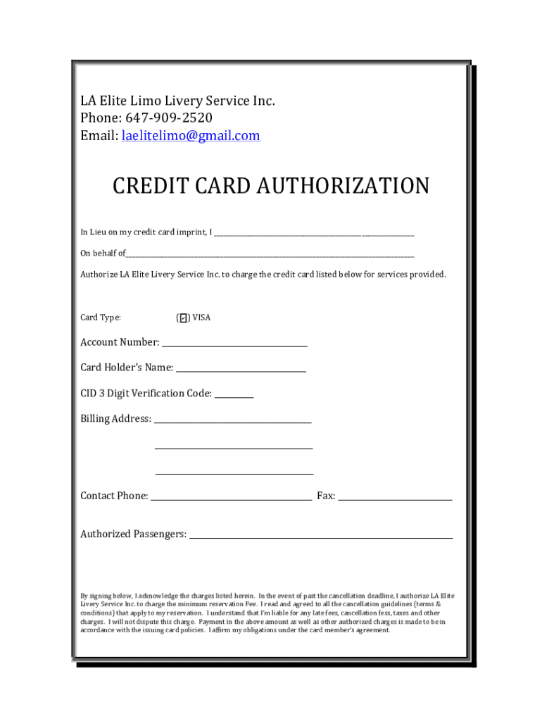 LA Elite Limo Livery Service Inc. Phone: 6479092520Email: laelitelimo@gmail.comCREDIT CARD AUTHORIZATION In Lieu on my credit card imprint, I ___On behalf of___Authorize LA Elite Livery Service Inc. to charge the credit card listed below for services provided.