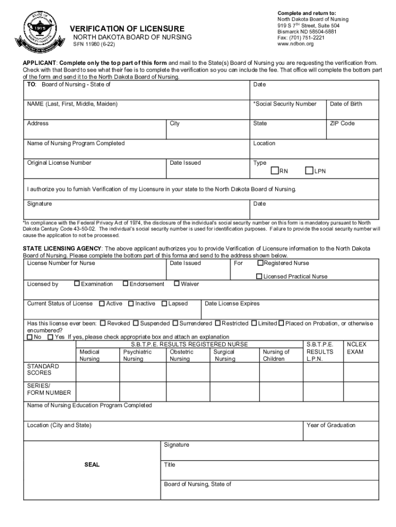 Complete and return to: North Dakota Board of Nursing 919 S 7TH Street, Suite 504 Bismarck ND 585045881 Fax: (701) 7512221 www.ndbon.orgVERIFICATION OF LICENSURENORTH DAKOTA BOARD OF NURSING SON 11980