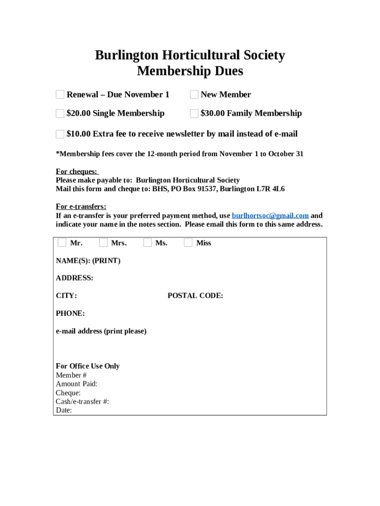 The Burlington Horticultural Society is a fillable form in MS Word extension that can be completed and signed for certain reasons. Next, it is provided to the relevant addressee in order to provide some info and data. The completion and signing is available in hard copy or using a suitable solution like PDFfiller. Such services help to submit any PDF or Word file without printing out. It also allows you to customize it for the needs you have and put legit digital signature. Once you're good, the user ought to send the Burlington Horticultural Society to the recipient or several recipients by email and also fax. PDFfiller offers a feature and options that make your document of MS Word extension printable. It has different options for printing out. It does no matter how you distribute a document - physically or electronically - it will always look well-designed and clear. In order not to create a new file from the beginning all the time, make the original document as a template. After that, you will have a customizable sample.