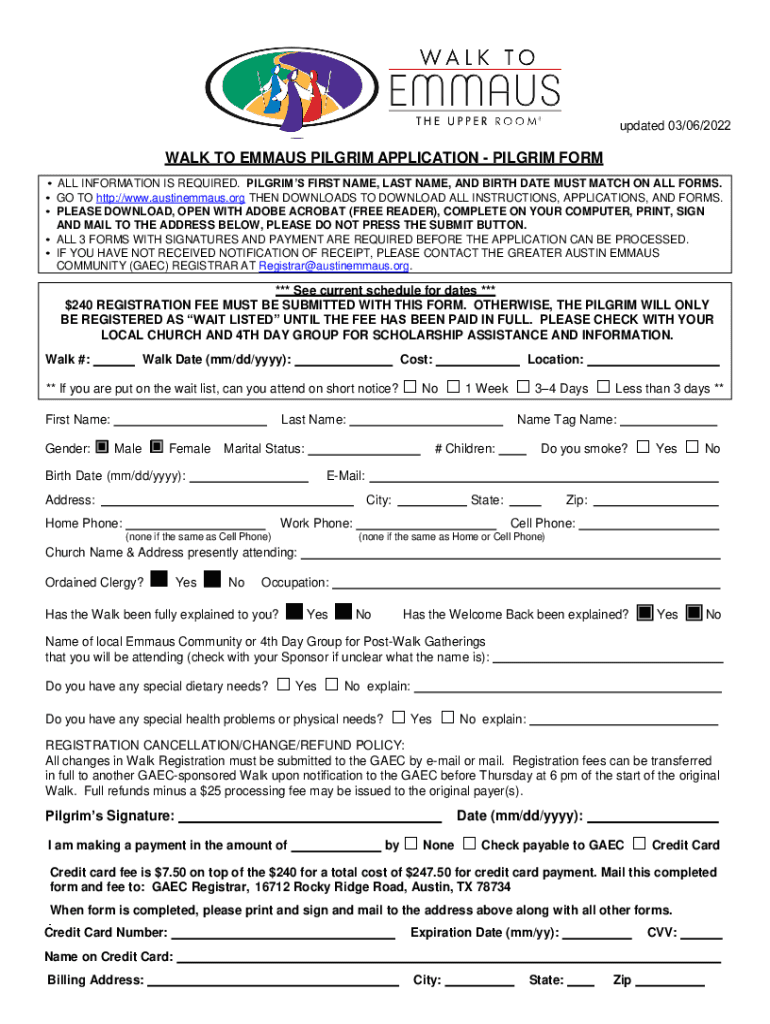 Updated 03/06/2022WALK TO EMM AUS PILGRIM APPLICATION PILGRIM FORM ALL INFORMATION IS REQUIRED. PILGRIMS FIRST NAME, LAST NAME, AND BIRTH DATE MUST MATCH ON ALL FORMS. GO TO http://www.austinemmaus.org
