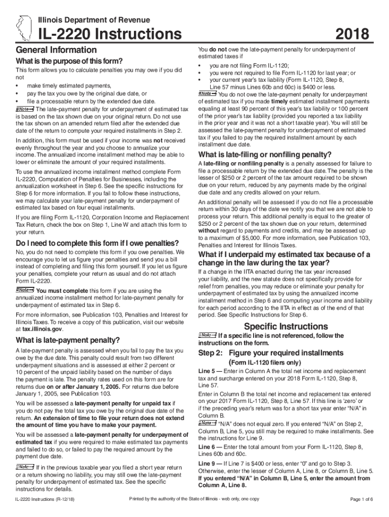 Illinois Department of RevenueIL2220 InstructionsGeneral Information do not owe the late payment penalty for underpayment of estimated taxes what is the purpose of this form? This form allows you