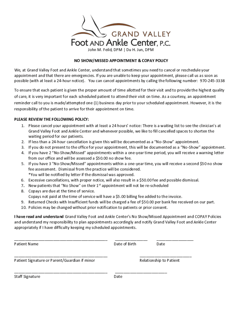 John M. Field, PM | Du H. Jun, PM NO SHOW/MISSED APPOINTMENT & COPAY POLICY We, at Grand Valley Foot and Ankle Center, understand that sometimes you need to cancel or reschedule your appointment and