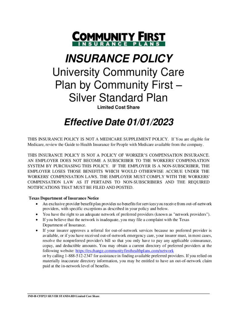 INSURANCE POLICY University Community Care Plan by Community First Silver Standard Plan Limited Cost ShareEffective Date 01/01/2023 THIS INSURANCE POLICY IS NOT A MEDICARE SUPPLEMENT POLICY. If You