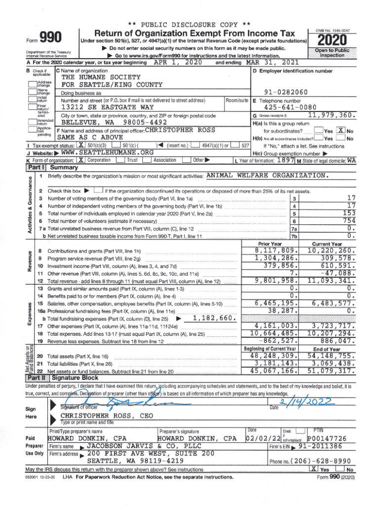 THE HUMANE SOCIETY FOR SEATTLE/KING COUNTY Form 990 (2020) Part III Statement of Program Service Accomplishments 1910282060Page 2Check if Schedule O contains a response or note to any line in this