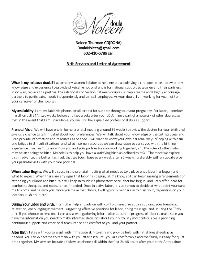 Noreen Thurman CD(DONA) DoulaNoleen@gmail.com 6024106786 cell Birth Services and Letter of AgreementWhat is my role as a Douala? I accompany women in labor to help ensure a satisfying birth experience.
