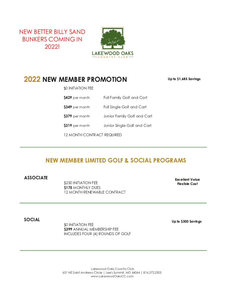 NEW BETTER BILLY SAND BUNKERS COMING IN 2022!2022 NEW MEMBER PROMOTION Up to $1,685 Savings$0 INITIATION FEE $429 per mouthful Family Golf and Cart$349 per mouthful Single Golf and Cart$379 per month