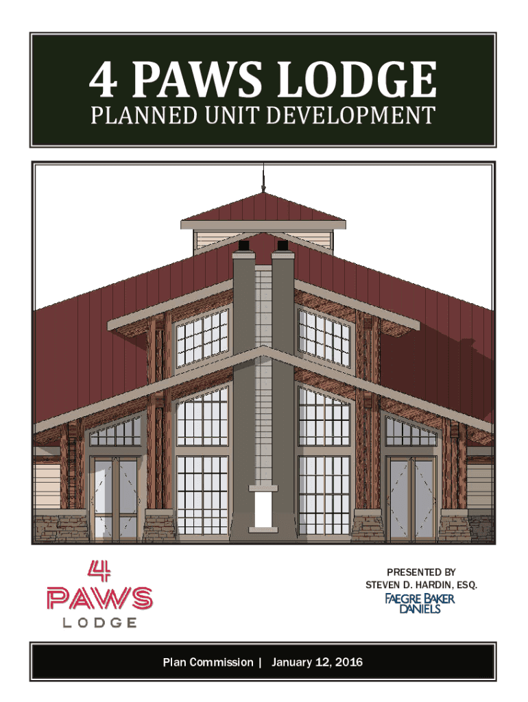 4 PAWS LODGE PLANNED UNIT DEVELOPMENTPRESENTED BY STEVEN D. HARDIN, ESQ. Plan Commission | January 12, 2016TABLE OF CONTENTS 4 PAWS LODGE Petitioner: Tom Ferrell 4 Paws Lodge, LLC 10808 Macabre Lane