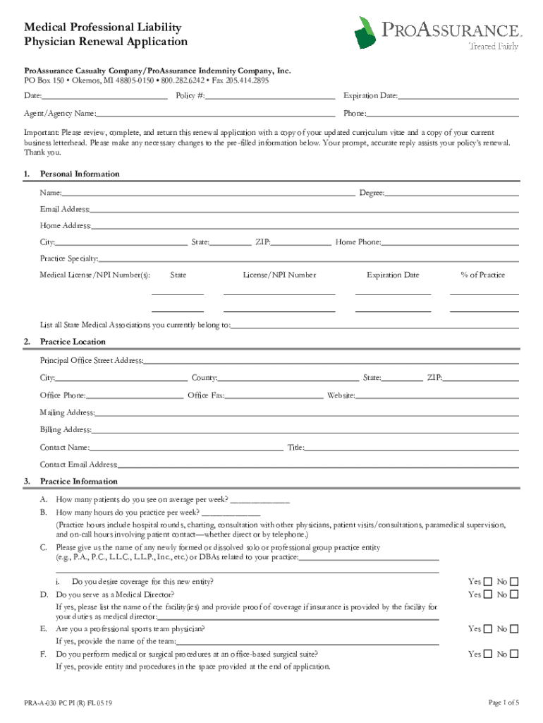 Medical Professional Liability Physician Renewal Application Reassurance Casualty Company/Reassurance Indemnity Company, Inc. PO Box 150 Demos, MI 488050150 800.282.6242 Fax 205.414.2895 Date:Policy