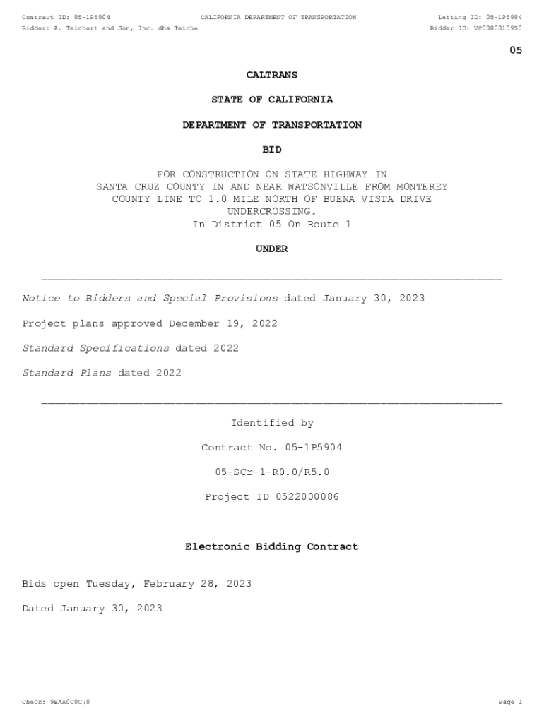 Contract ID: 051P5904CALIFORNIA DEPARTMENT OF TRANSPORTATIONBidder: A. Teacher and Son, Inc. DBA Teacher ConstructionLetting ID: 051P5904