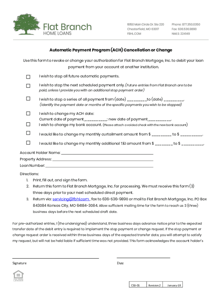 Automatic Payment Program (ACH) Cancellation or Change Use this form to revoke or change your authorization for Flat Branch Mortgage, Inc. to debit your loan payment from your account at another institution.