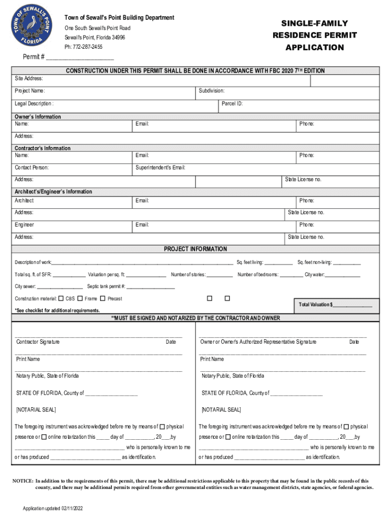 Town of Seawall\'s Point Building DepartmentSINGLEFAMILYOne South Seawall\'s Point RoadRESIDENCE PERMITSewall\'s Point, Florida 34996APPLICATIONPh: 7722872455Permit # ___CONSTRUCTION UNDER THIS PERMIT