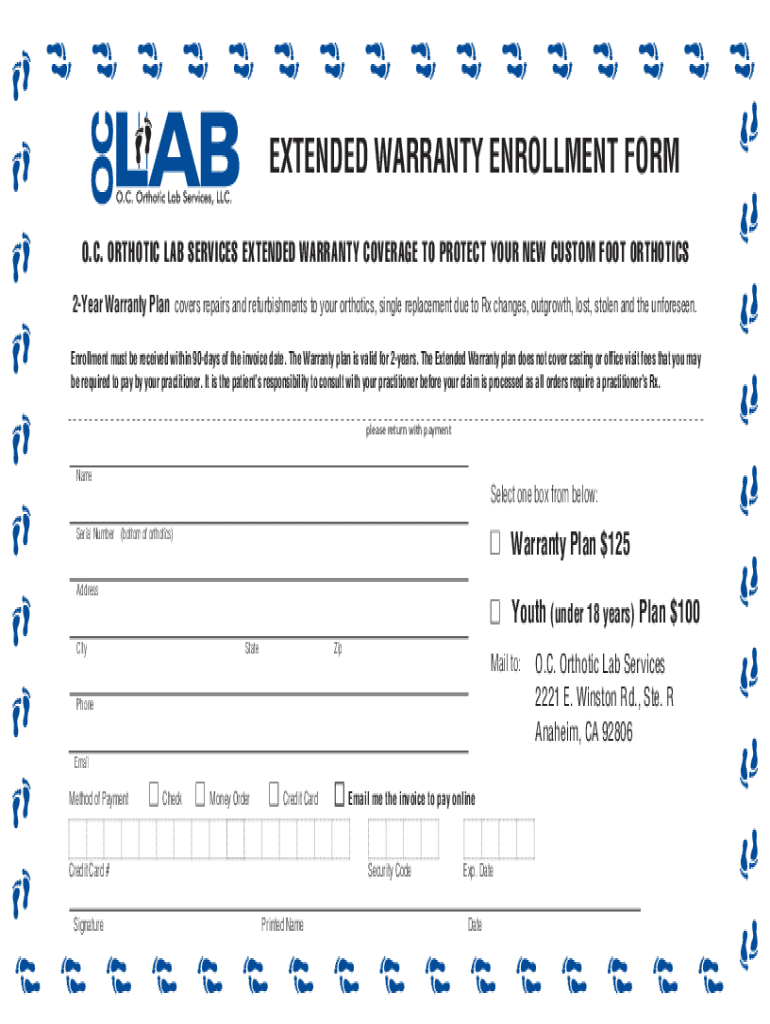 EXTENDED WARRANTY ENROLLMENT FORM O.C. ORTHOTIC LAB SERVICES EXTENDED WARRANTY COVERAGE TO PROTECT YOUR NEW CUSTOM FOOT ORTHOTICS 2Year Warranty Plan covers repairs and refurbishments to your orthotics,