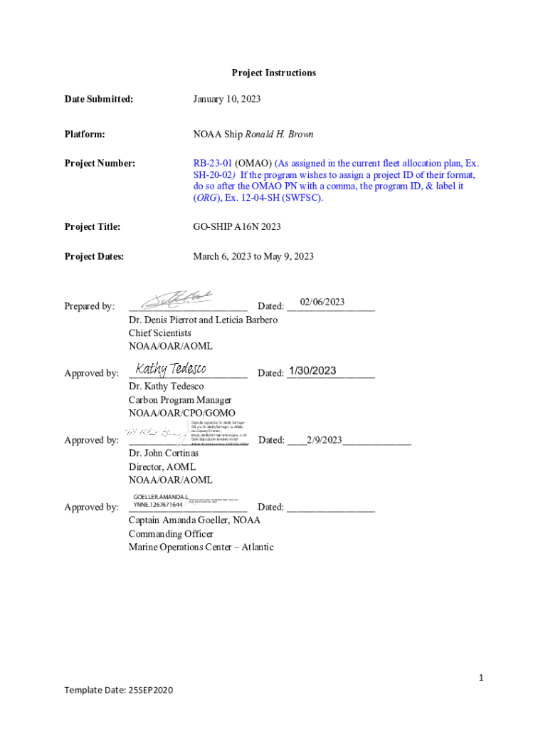 Project Instructions Date Submitted:January 10, 2023Platform:NOAA Ship Ronald H. BrownProject Number:RB2301 (MAO) (As assigned in the current fleet allocation plan, Ex. SH2002) If the program wishes