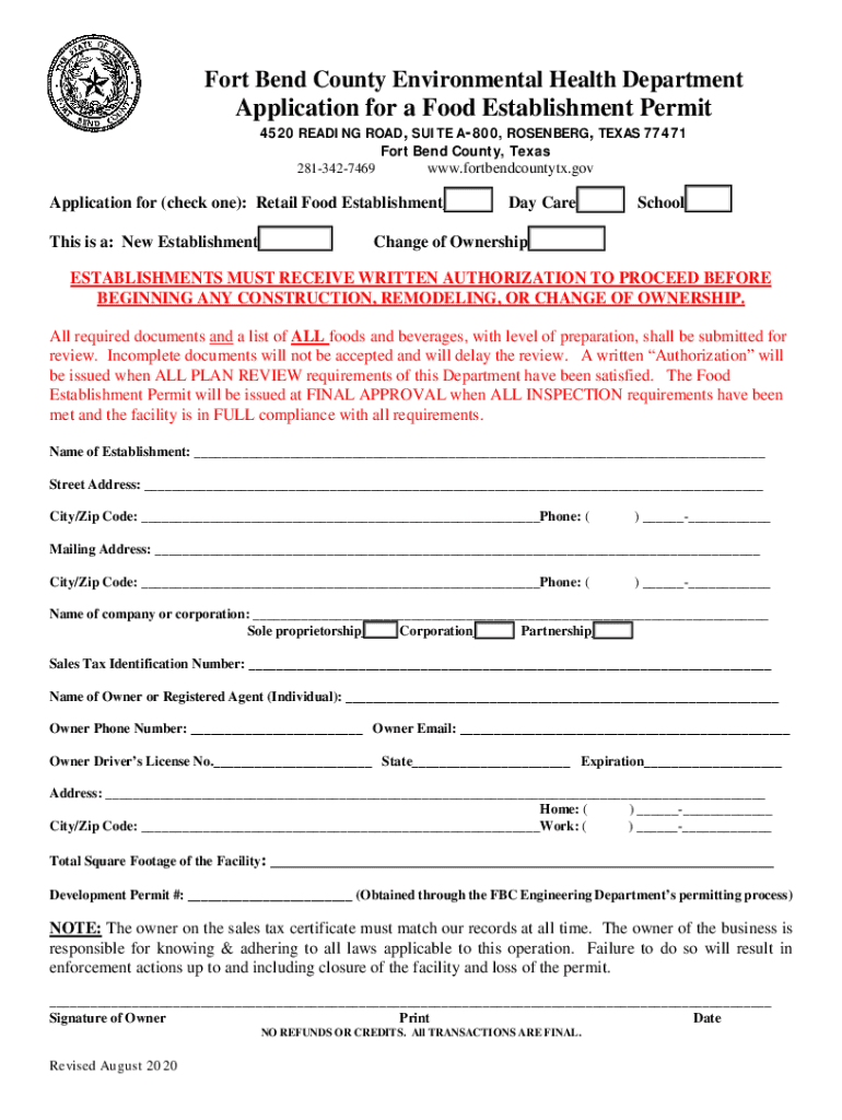 Fort Bend County Environmental Health Departmentalization for a Food Establishment Permit 4520 READING ROAD, SUITE A800, ROSENBERG, TEXAS 77471 Fort Bend County, Texas www.fortbendcountytx.gov 2813427469Application