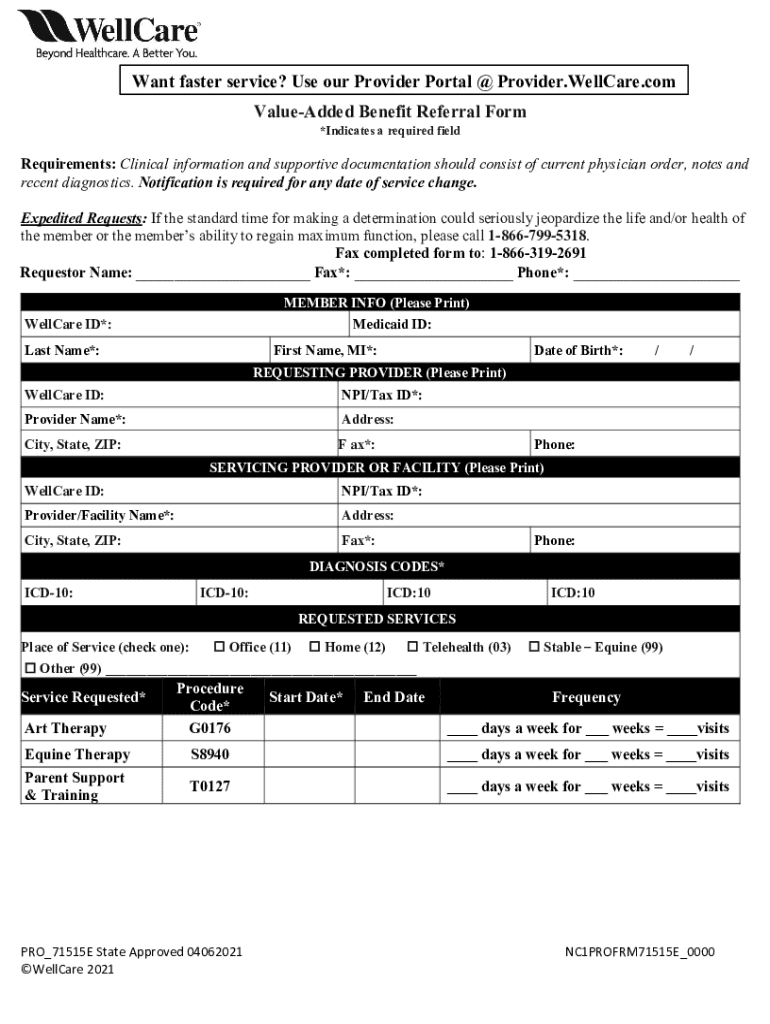 Want faster service? Use our Provider Portal @ Provider.WellCare.com Valuated Benefit Referral Form *Indicates a required fieldRequirements: Clinical information and supportive documentation should
