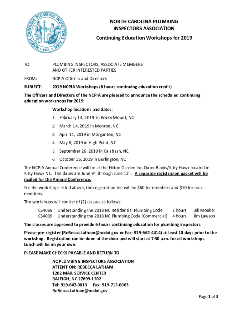 Continuing Education Workshops for 2019TO:PLUMBING INSPECTORS, ASSOCIATE MEMBERS
