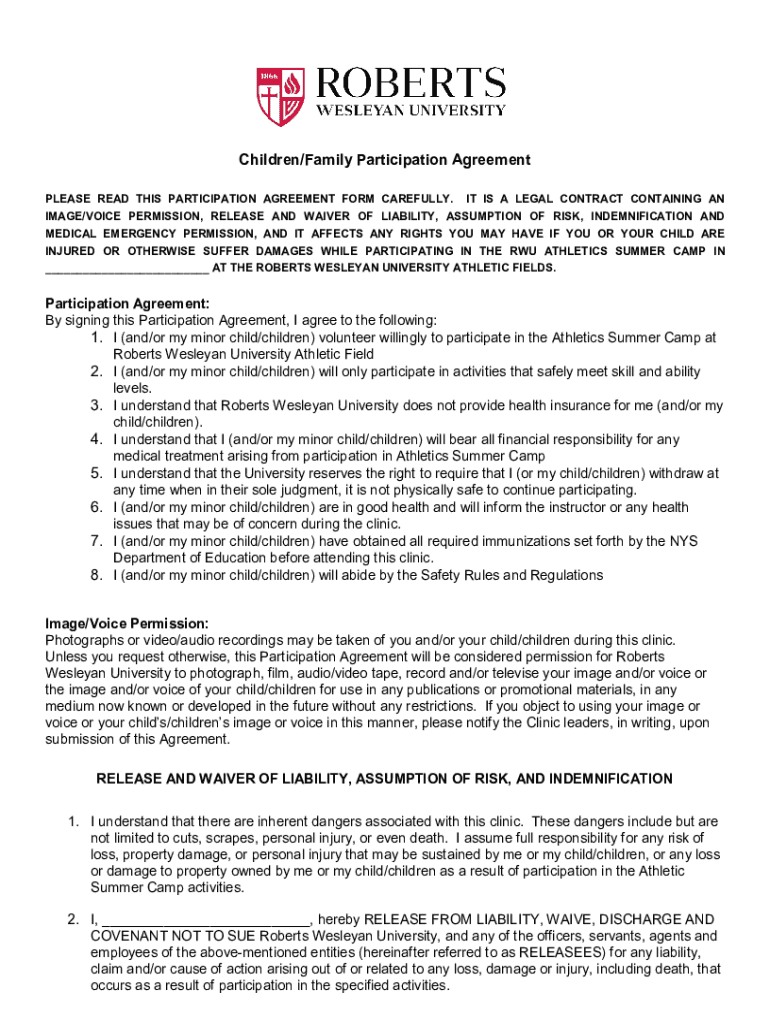 Children/Family Participation Agreement PLEASE READ THIS PARTICIPATION AGREEMENT FORM CAREFULLY. IT IS A LEGAL CONTRACT CONTAINING AN IMAGE/VOICE PERMISSION, RELEASE AND WAIVER OF LIABILITY, ASSUMPTION