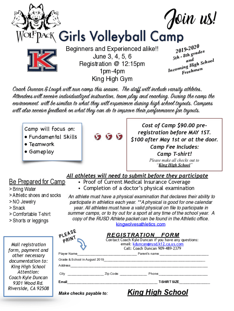 Girls Volleyball Camp2020 2019 rads 8thBeginners and Experienced alike!! June 3, 4, 5, 6 Registration @ 12:15pm 1pm4pm King High Gym5thand School h g His n i m me Into FreshCoach Duncan & Lough will