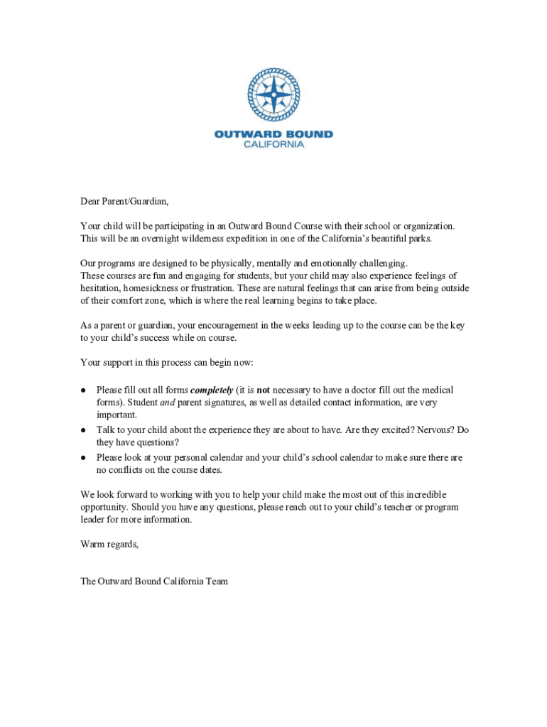 Dear Parent/Guardian, Your child will be participating in an Outward Bound Course with their school or organization. This will be an overnight wilderness expedition in one of the California's beautiful