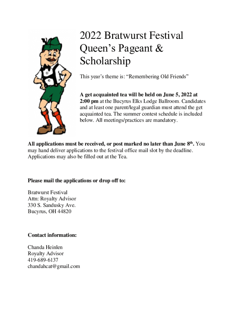 2022 Bratwurst Festival Queens Pageant & Scholarship This year's theme is: Remembering Old Friends A get acquainted tea will be held on June 5, 2022, at 2:00 pm at the Cyrus Elks Lodge Ballroom. Candidates