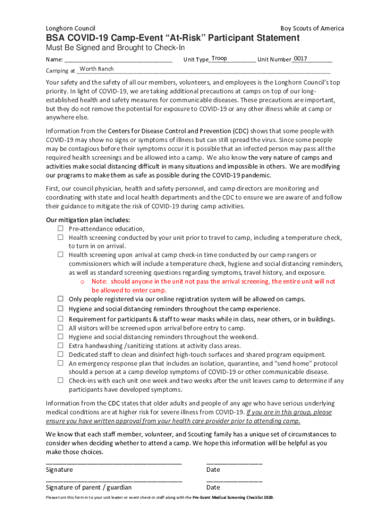 LonghornCouncilBoyScoutsofAmericaBSA COVID-19 Competent Risk Participant Statement Must Be Signed and Brought to check in Troop 0017 Name:___ UnitType___UnitNumber___ Worth Ranch Campingat___Yoursafetyandthesafetyofallourmembers,