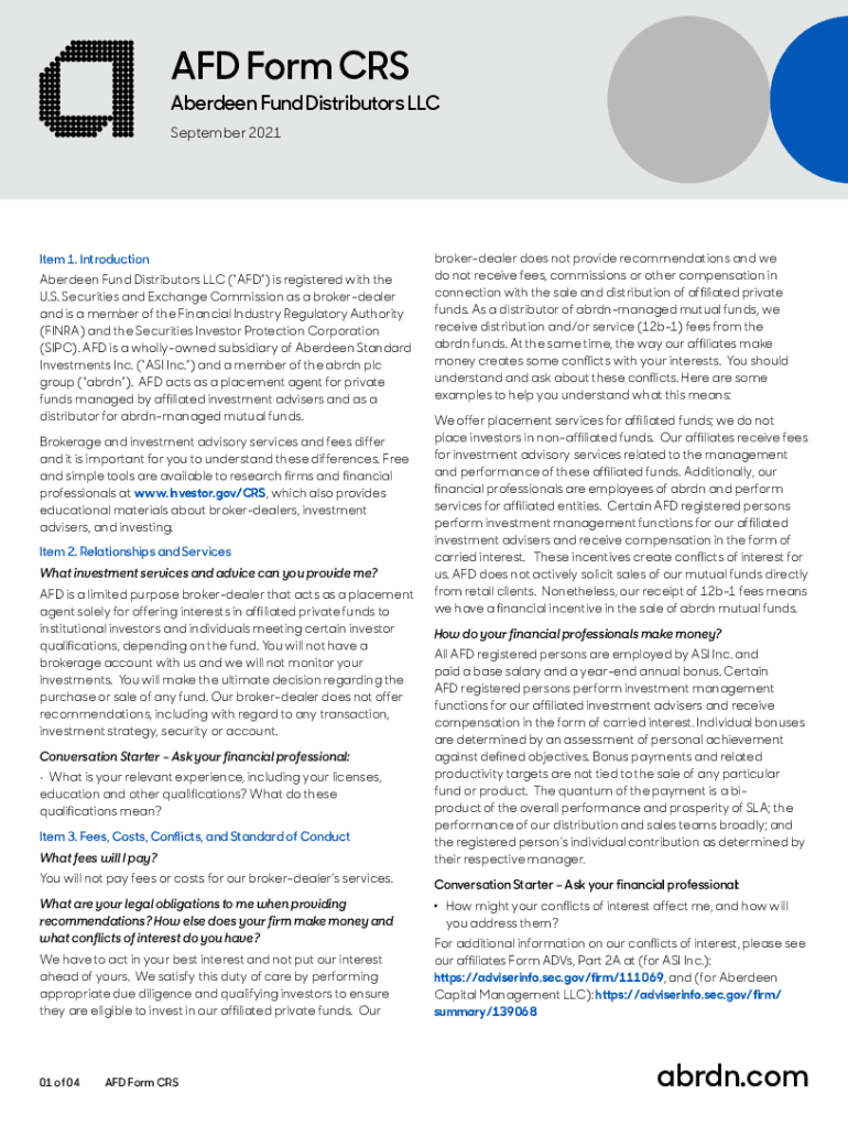 AFD Form CRS Aberdeen Fund Distributors LLC September 2021Item 1. Introduction Aberdeen Fund Distributors LLC (AFD) is registered with the U.S. Securities and Exchange Commission as a broker dealer