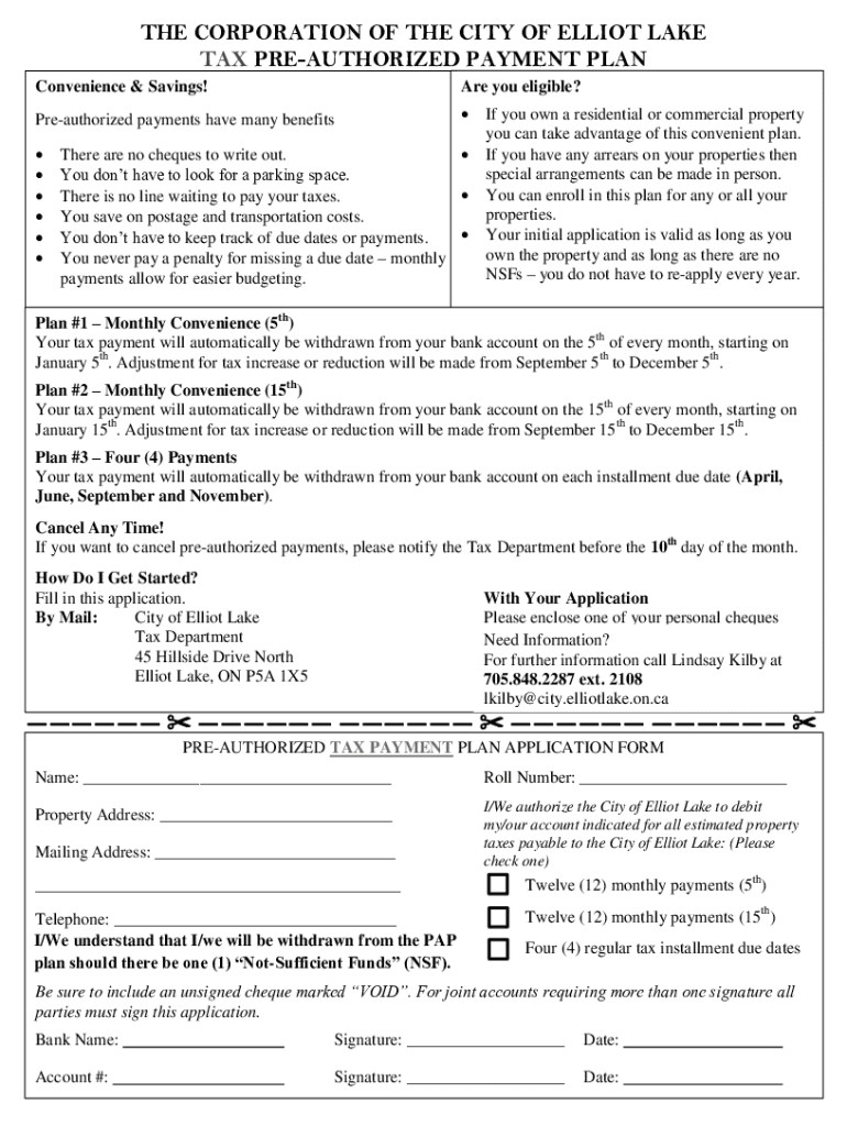 THE CORPORATION OF THE CITY OF ELLIOT LAKE TAX PREAUTHORIZED PAYMENT PLAN Convenience & Savings! Are you eligible? Preauthorized payments have many benefits. There are no checks to write out. You