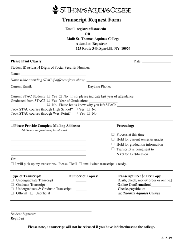 Transcript Request Form Email: registrar@stac.edu OR Mail: St. Thomas Aquinas College Attention: Registrar 125 Route 340, Spar kill, NY 10976Please Print Clearly:Date: ___Student ID or Last 4 Digits