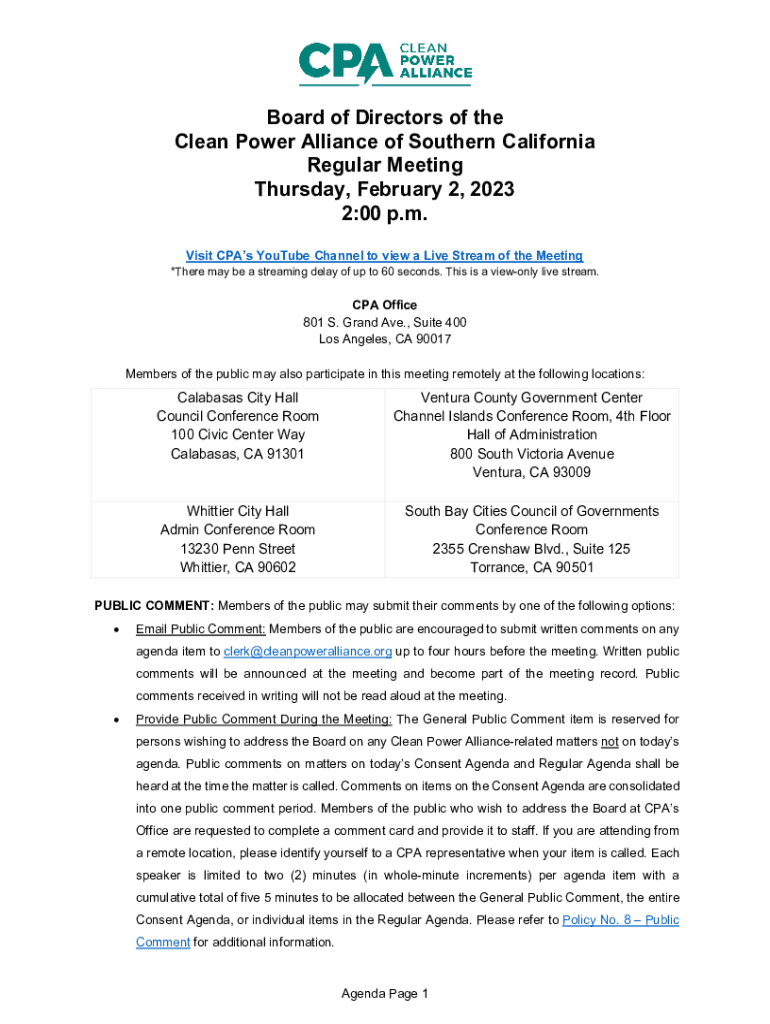 Board of Directors of the Clean Power Alliance of Southern California Regular Meeting Thursday, February 2, 2023 2:00 p.m. Visit CPA's YouTube Channel to view a Live Stream of the Meeting×There may