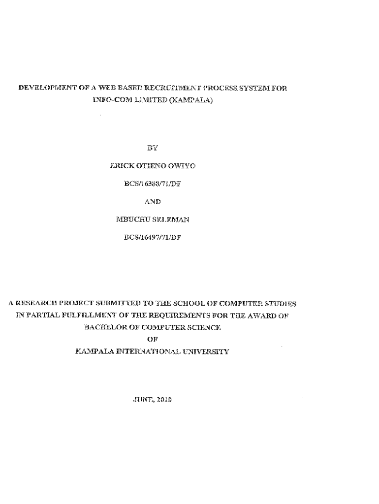 DEVELOPMENT OF A WEB BASED RECRUITMENT PROCESS SYSTEM FOR INFO COM LIMITED (KAMPALA)BY ERICK ORIENT OHIO BCS/16388/71/OF AND MUCH SALESMAN BCS116497171/DFA RESEARCH PROJECT SUBMITTED TO THE SCHOOL