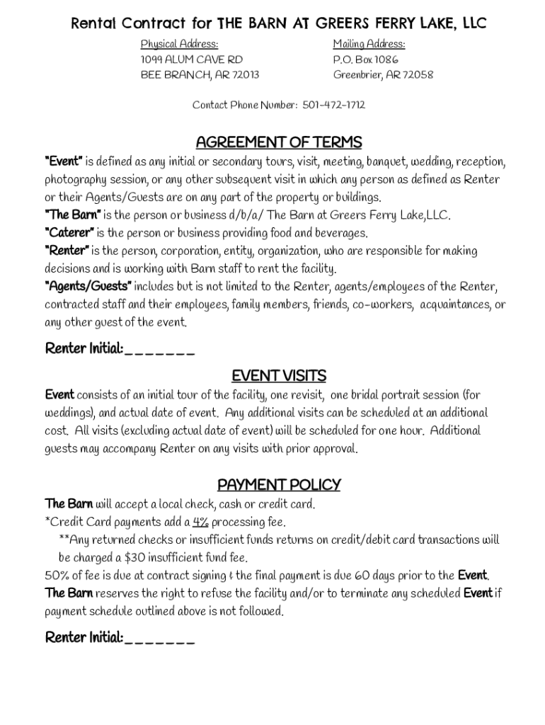 Rental Contract for THE BARN AT GREEKS FERRY LAKE, LLC Physical Address: 1099 ALUM CAVE RD BEE BRANCH, AR 72013Mailing Address: P.O. Box 1086 Greenbrier, AR 72058Contact Phone Number: 5014721712AGREEMENT