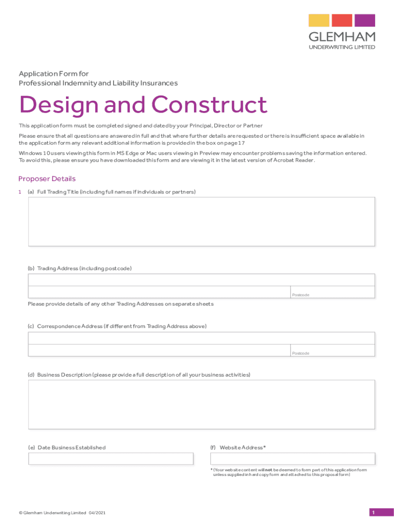Application Form for Professional Indemnity and Liability InsurancesDesign and Construct This application form must be completed signed and dated by your Principal, Director or Partner Please ensure